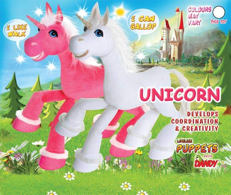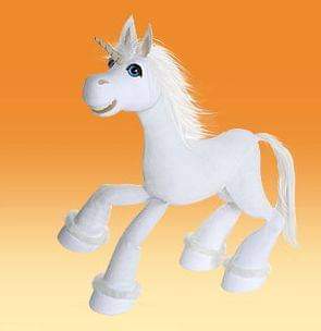 Magický jednorožec - stačí málo a bude mluvit, kouzlit, kráčet a odnese vás cvalem do země pohádek. Věrnou imitaci jednorožcovho pohybu dosáhneme záměnou provázků na zadních nohách. Má 6 provázků a rozebíratelné vodítko. Je 42 cm vysoký.